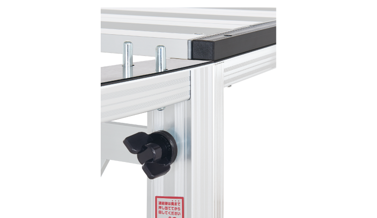 アルミ座面板・足場板の両切断面に樹脂製のキャップをはめ込み、手や衣服を傷つけない、座面板・足場板一枚あたり耐荷重約600kgの安心構造です。 -